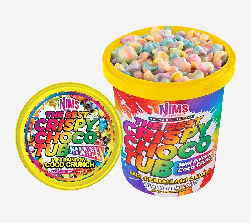 Colorful fun cereal in mini rainbow crunch generously bathed in silky white chocolate