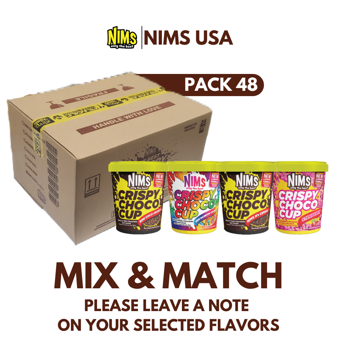 Nims Crispy Choco Cup Assorted Flavors 60g (PACK 48) contain all four flavors; Mini Coco Crunch (12pcs), Mini Rainbow Crunch (12pcs), Starberry (12pcs) and Nims N's Cereal (12pcs)